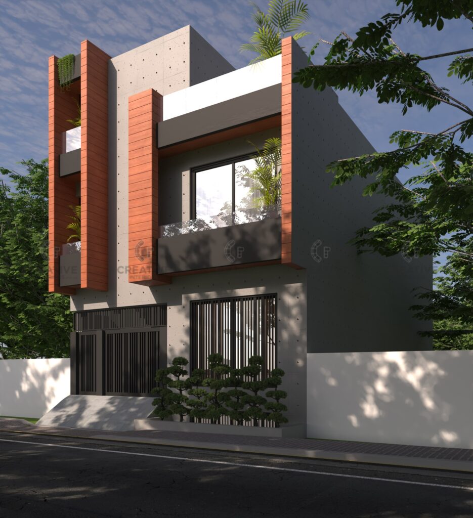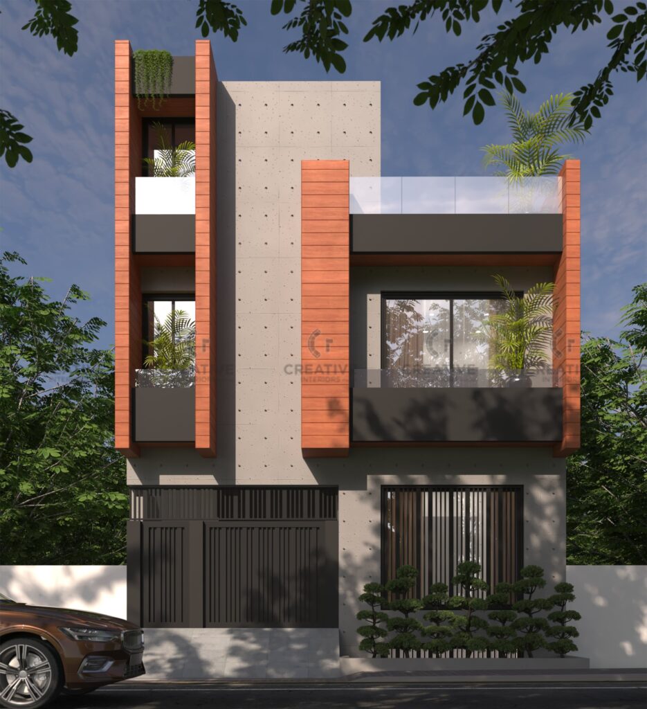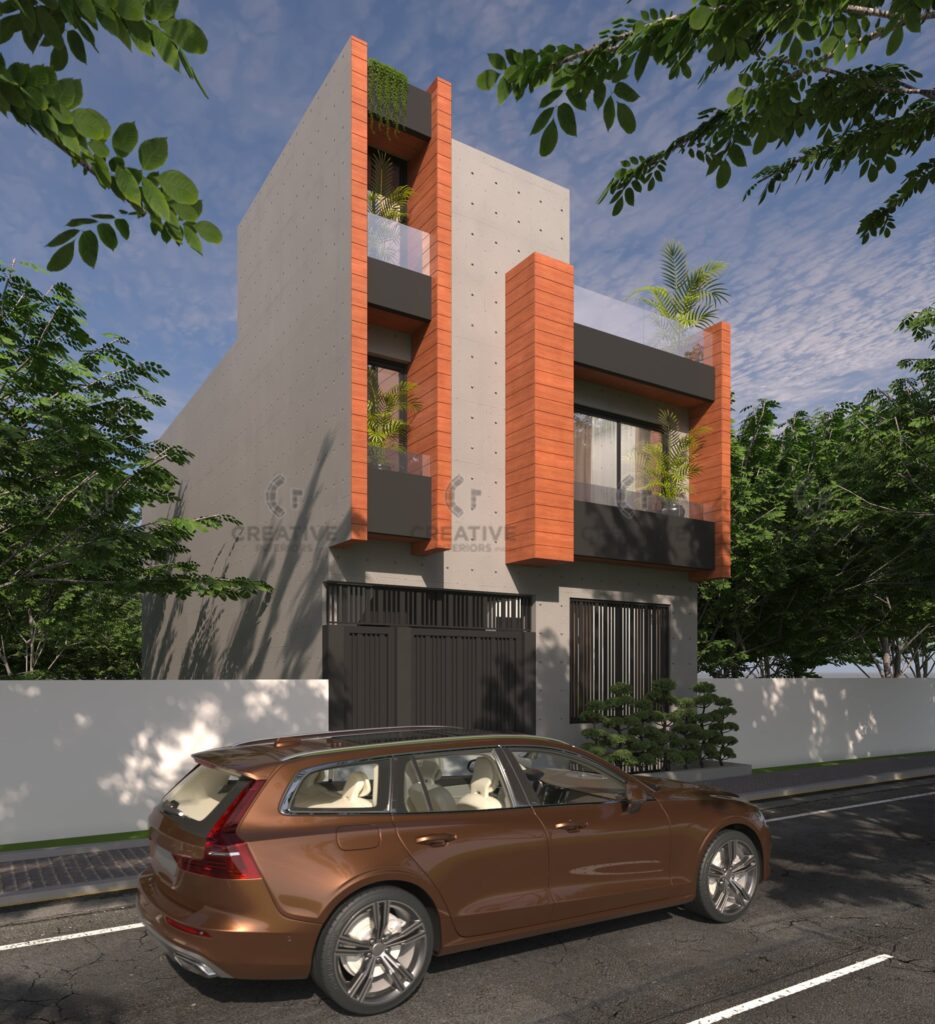 This 5 Marla house, designed by Creative Interiors Pvt Ltd, reflects a refined balance of modern minimalism and bold architectural detailing. The façade embraces a sleek composition of exposed concrete textures combined with rich wooden cladding elements, enhancing the verticality and visual rhythm of the structure. Large windows and glass balustrades invite natural light, creating an airy openness, while the strategic placement of greenery softens the robust geometry, adding a refreshing organic contrast. The dark-toned gate and railings further complement the overall color palette, ensuring both security and sophistication. With its clean lines, thoughtful material selection, and timeless aesthetic, this residence stands as a statement of modern architectural elegance tailored to urban living.