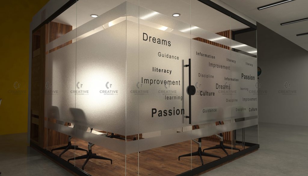 A key feature of the space is the use of glass partitions with frosted graphics, providing privacy while maintaining visual openness. Custom-designed furniture, vertical wooden elements, and carefully planned lighting enhance the overall spatial quality and add depth to the interior.