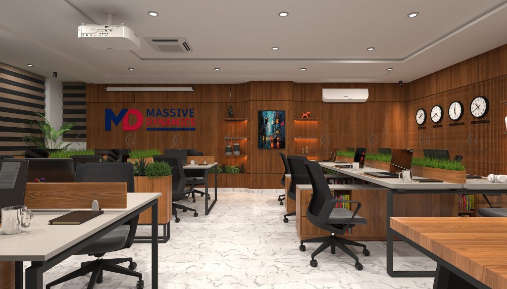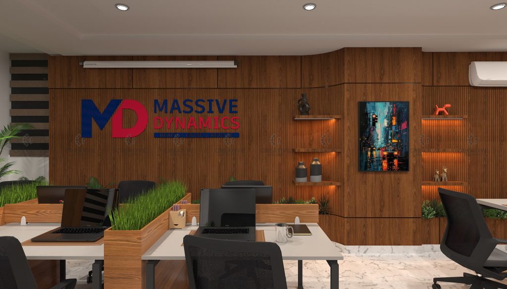 The Massive Dynamic, envisioned by Creative Interiors, embodies a sleek and contemporary workspace tailored for a compact corporate environment. The layout thoughtfully integrates a manager’s cabin, team lead zone, and open workstations, ensuring seamless workflow and well-defined functional zoning.