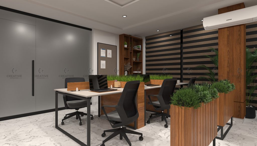Accentuated by carefully curated ceiling lighting, branded feature walls, bespoke shelving, and ergonomic furnishings, the design elevates both aesthetics and functionality. This project exemplifies Creative Interiors’ mastery in modern office design, space optimization, and corporate planning—delivering a workspace that is efficient, inspiring, and perfectly suited for the ambitions of growing businesses.