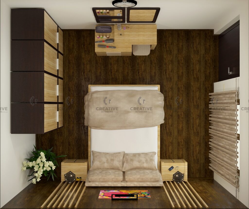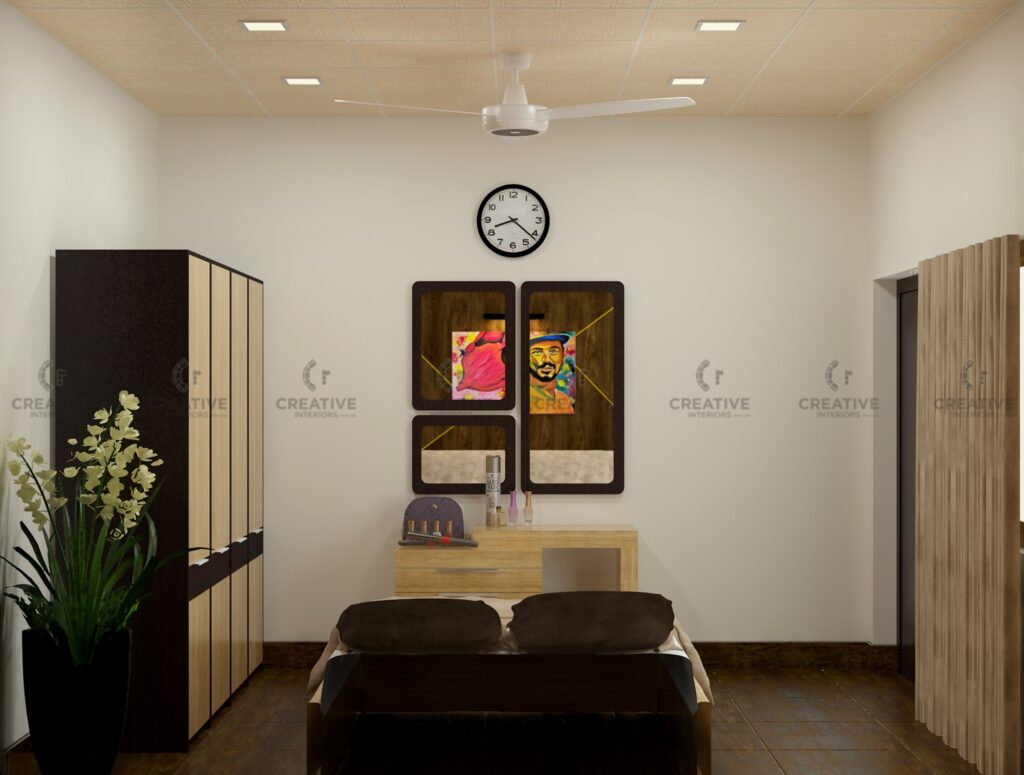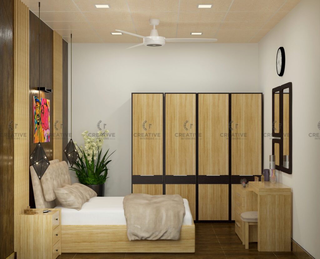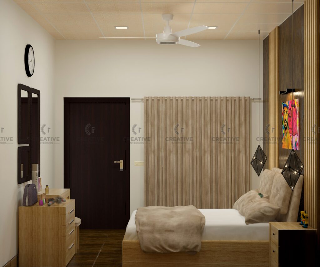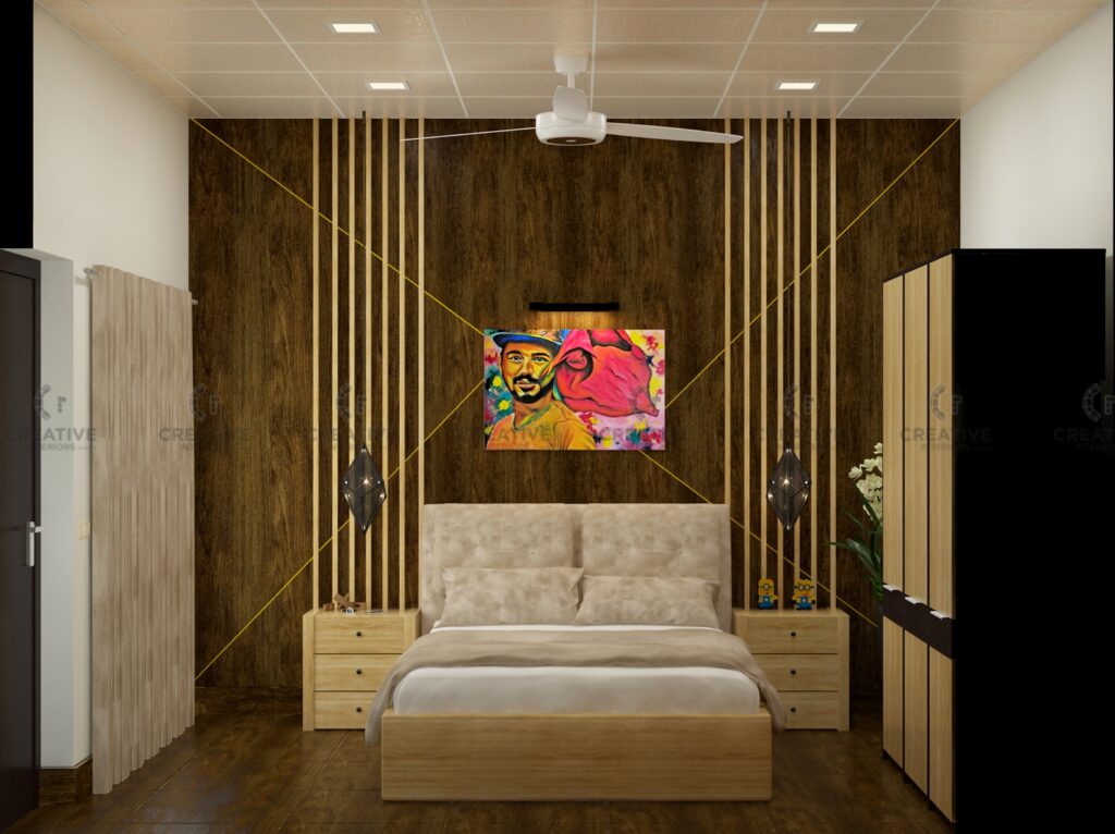 This bedroom design by Creative Interiors Pvt. Ltd. reflects a perfect balance between warmth and elegance. The use of rich wooden textures, soft neutral tones, and clean modern lines creates a serene yet stylish ambiance. Thoughtfully crafted elements such as the vertical wooden slats, ambient lighting, and customized furniture pieces enhance both comfort and functionality. The accent wall, complemented by vibrant artwork, adds personality to the space while maintaining a cohesive and inviting atmosphere — a true example of modern sophistication tailored for contemporary living.\