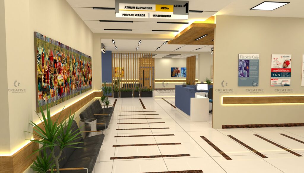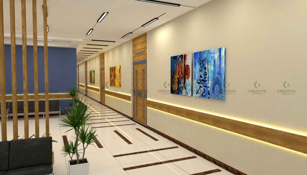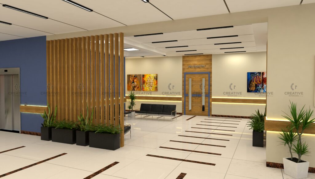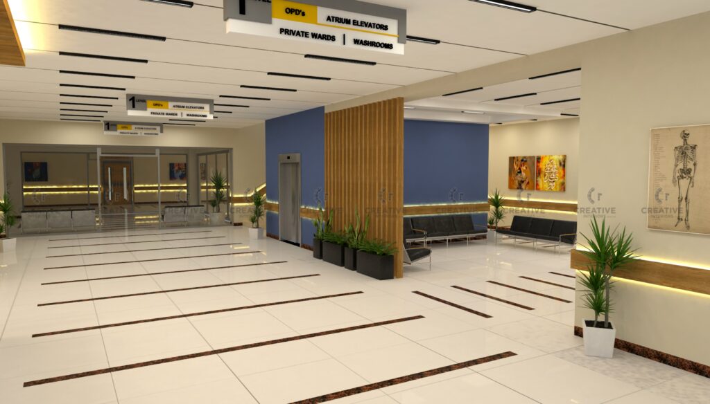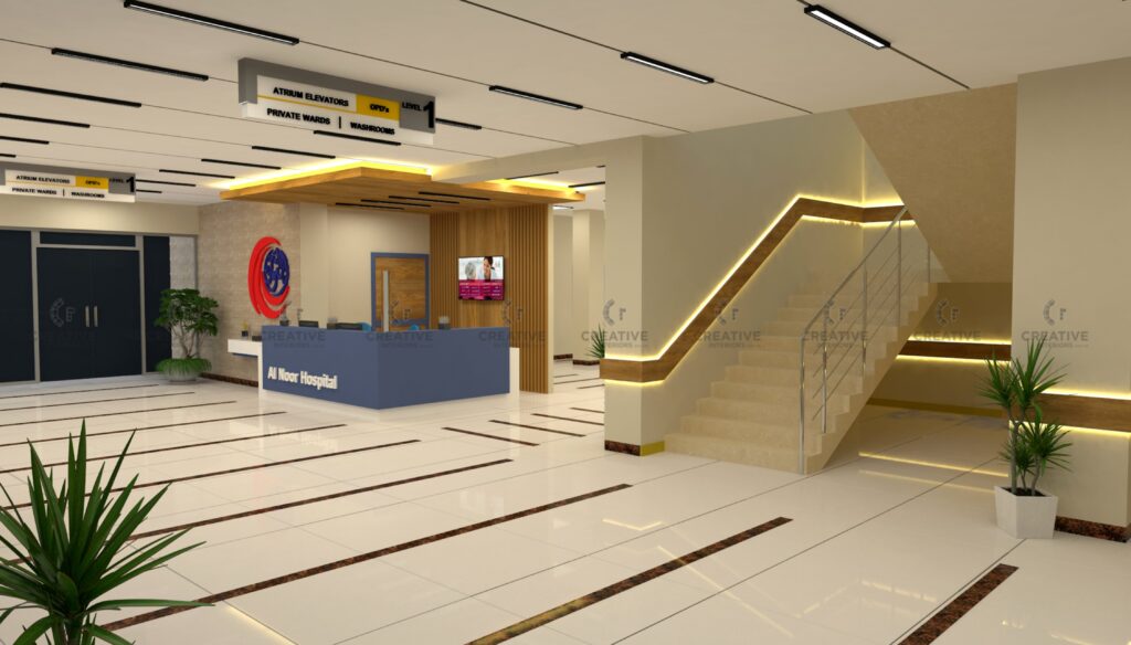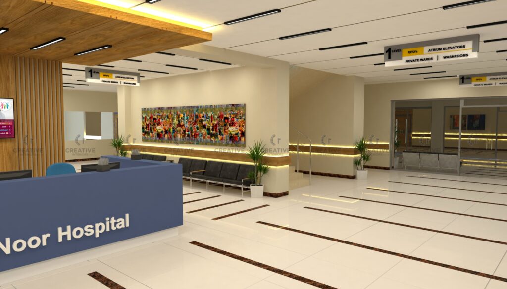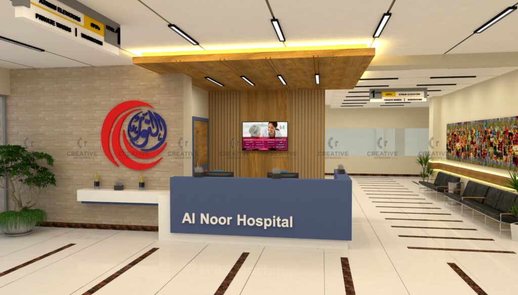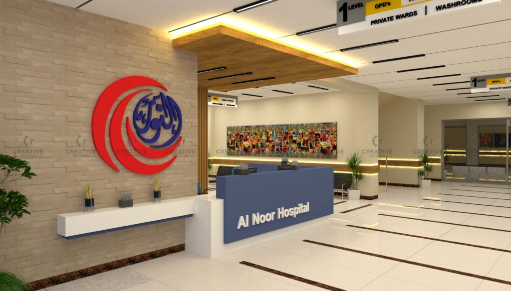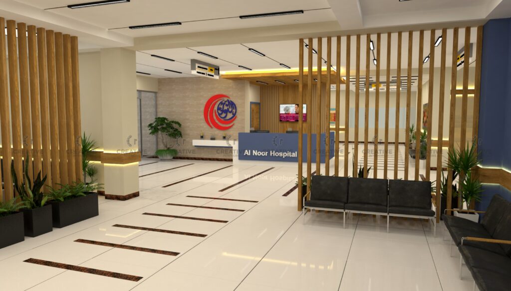 Al Noor Hospital, a project under the Hussain Lakhani Group, is located in the heart of Rawalpindi near Liaquat Bagh. The design proposal has been conceptualized and executed by Creative Interiors Pvt. Ltd., focusing on creating a refined blend of functionality and aesthetics suitable for a state-of-the-art healthcare facility. The reception and ground floor areas reflect a modern, welcoming atmosphere through the use of warm lighting, well-planned circulation, and clearly visible signage ensuring effortless wayfinding for patients and visitors. The choice of sustainable materials and a soothing color palette enhances the overall comfort and environmental harmony. Natural textures, accent wood ceilings, and minimal yet vibrant décor elements—as seen in the provided visuals—add sophistication to the space while maintaining a professional and hygienic environment. Every design decision emphasizes patient-centered care, efficient movement, and visual calmness within the hospital setting.