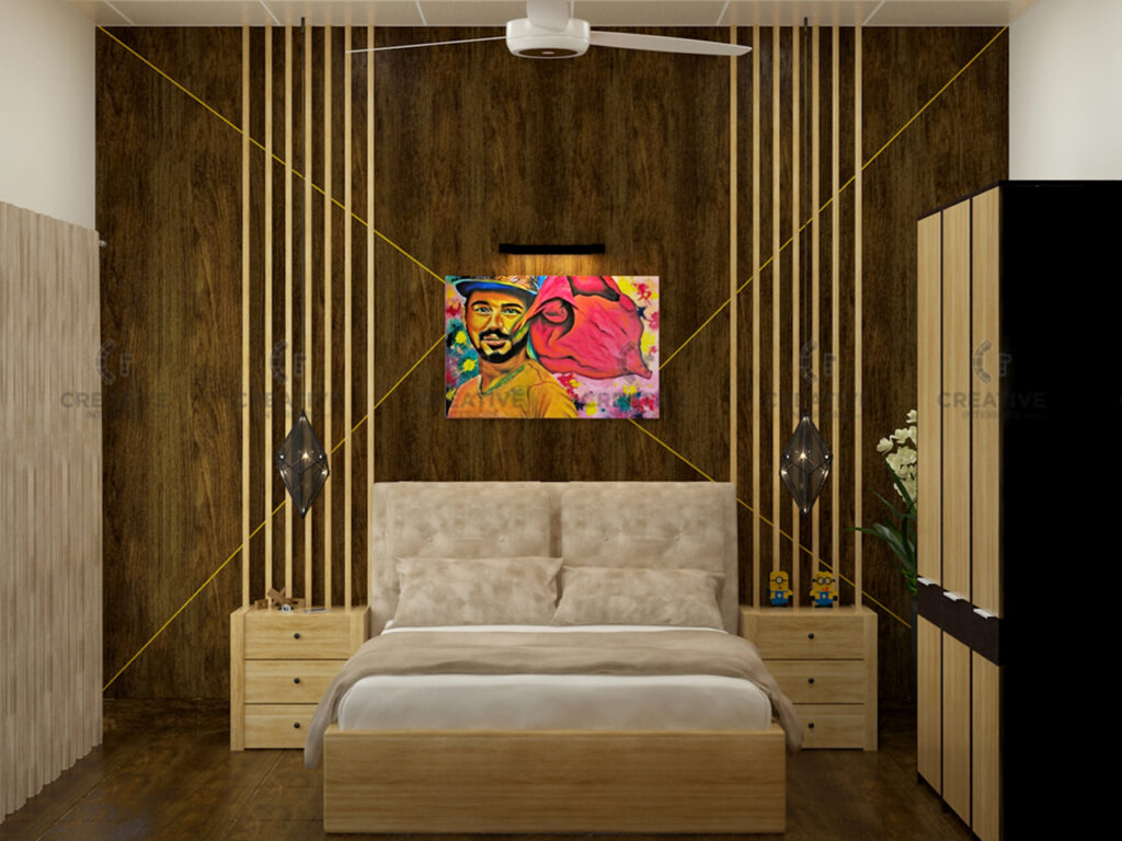 This contemporary bedroom design by Creative Interiors Pvt. Ltd. combines functionality and artistic elegance. The bold use of matte black cabinetry with warm wooden textures gives the room a refined and modern look. A vibrant multi-panel painting adds a burst of color and energy, creating a perfect contrast with the soft neutral palette. The design […]